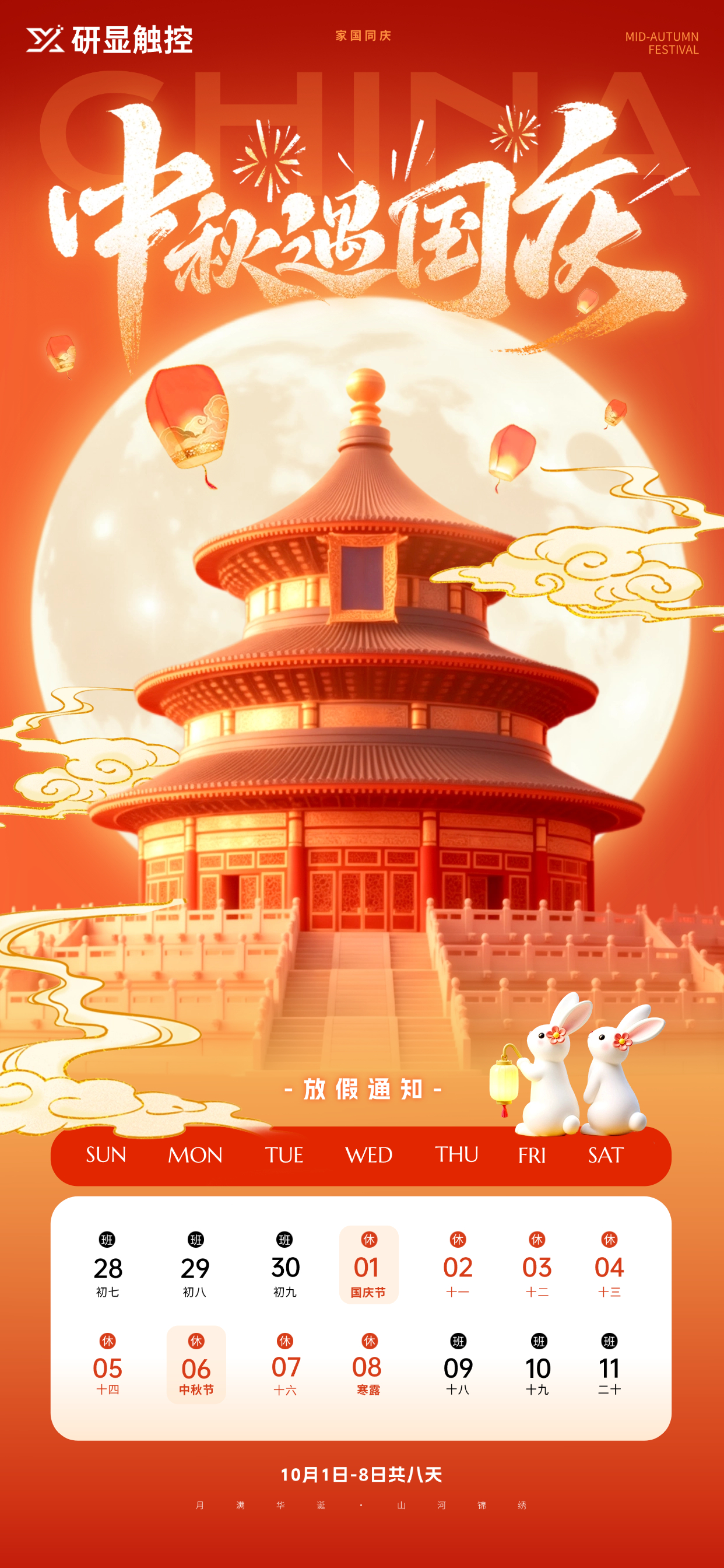 金秋送爽,丹桂飘香,在国庆与中秋佳节来临之际,结合国家法定节假日规定,我司定于2025年10月1日至2025年10月8日放假,共8天,10月9日正常上班。